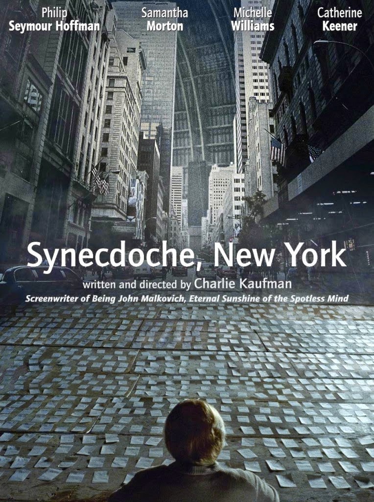 Det jag mest hade hört om denna film är den stora teateruppsättningen Caden sätter upp och att han hyr skådespelare som spelar (i filmen) riktiga personer I en gigantisk lagerlokal bygger han upp en kopia av den del an New York han bor i. Han hyr skådespelare som spelar honom själv och alla i hans omgivning. När skådespelarna inte hinner med hyr han in nya skådespelare som spelar skådespelarna som spelar personerna. Typ. Dianne West anställs för att spela en städtant och det slutar med att hon spelar Caden och tar över regisserandet av teaterstycket. Den har aldrig premiär. Caden själv slutar som städtanten i kopian av den byggnad dit Adele flyttat när hon flyttat tillbaka till New York för många, många år sedan.