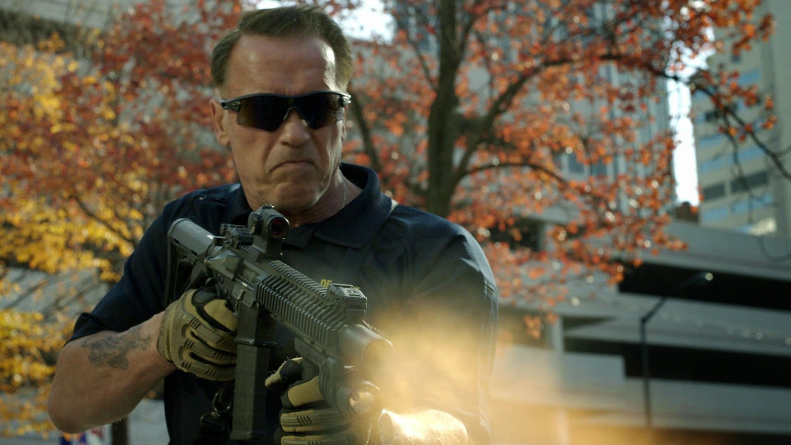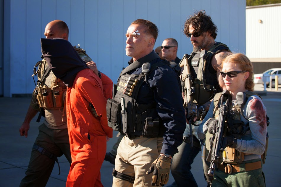 Arnold spelar polisenhetens ledare John "Breacher" Wharton. Han börjar se ganska gammal ut nu, den gode Arnold, men det funkar här då han spelar en åldrig gammal krigare. När han trycker upp en av de yngre och mycket större kollegorna mot väggen i ett internt gräl tror jag på scenen ett hundra procent. Det finns en självklarhet i Arnolds fysiska aktioner som jag helt köper.